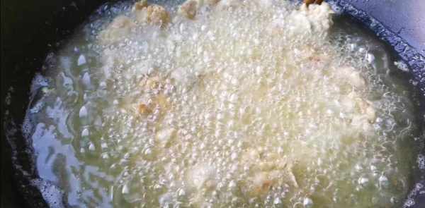 第六步:鍋燒熱倒入多一點的食用油,把筷子放入油鍋裡立即冒泡泡時,就可以放入裹好的雞塊炸兩,一個一個的放,防止粘連在一起,全部放入炸至定型用鏟子輕輕的推動一下。