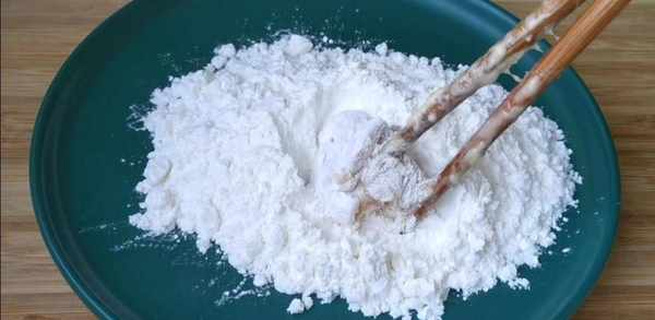 第五步:盤子裡倒入一大勺淀粉,我用的是地瓜淀粉,把雞塊再裹上一層淀粉,全部裹好放一旁備用。