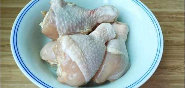 第一步:把5個雞腿洗凈去除雞腿骨,刀挨著骨頭把肉切下來,再切小方塊,切好放入大碗裡;然後把薑切薑絲,蒜切片,切好放入雞塊的碗裡。