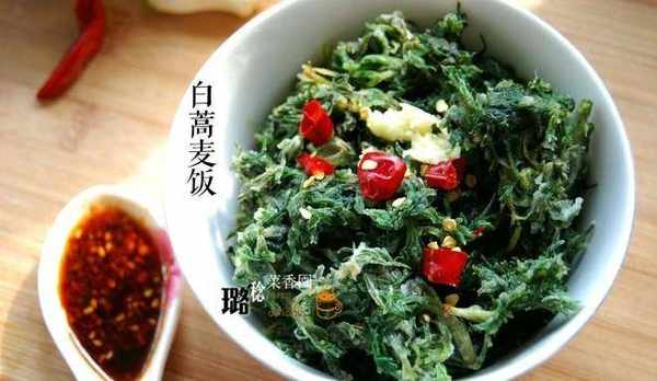 把撒瞭面粉的白蒿輕輕放在蒸籠的爐排上。蒸時,用高溫蒸7-8分鐘。取出蒸籠,打開,趁熱攤開。在蒜泥中加入醬油、鹽和醋,然後加入醬油中。在一個熱油鍋裡,燉大蒜,胡椒,辣椒面,芝麻,然後將紅油蒜汁倒入麥飯,拌勻後開始食用。