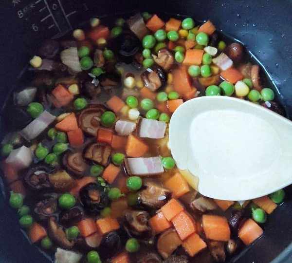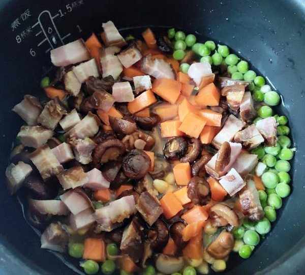 第6步、將豌豆和玉米洗幹凈加入,胡蘿卜、香菇和臘肉丁加入。