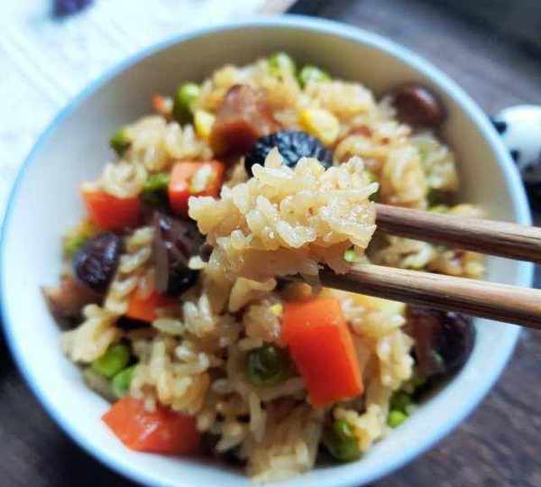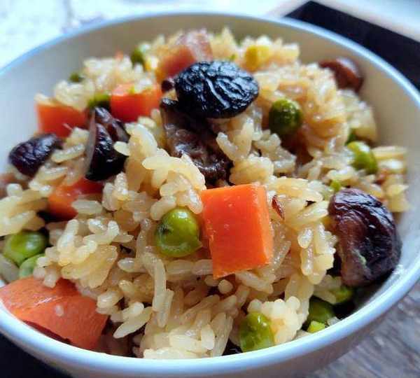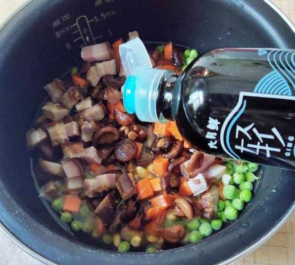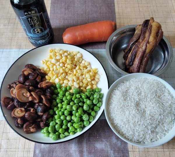 原料:大米、臘肉、幹香菇、胡蘿卜、玉米粒、豌豆、原汁醬油。