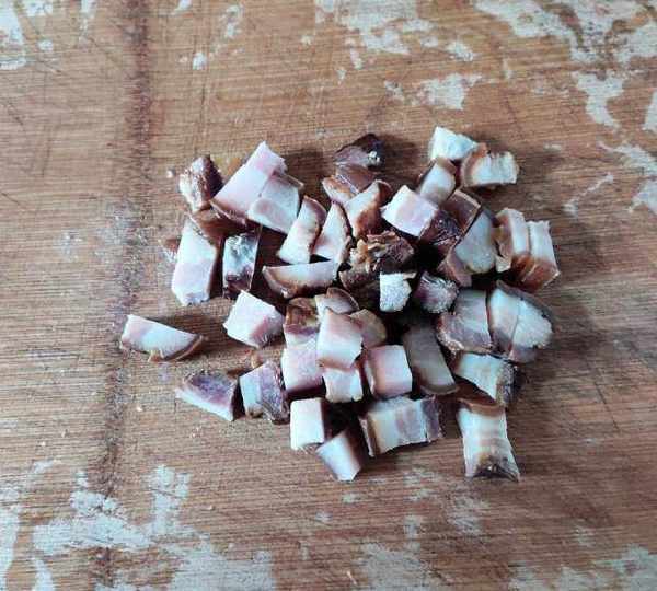 第4步、臘肉最好先泡半小時,泡去多餘鹽分,刮洗幹凈,切丁。