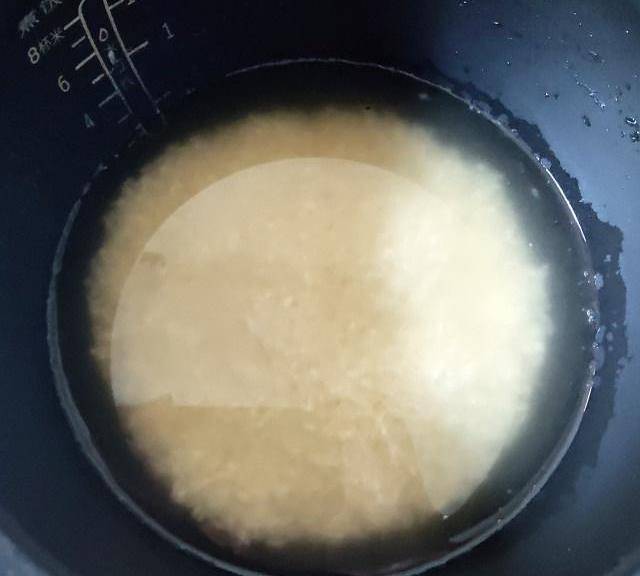 第5步、米淘洗幹凈,加入第二次泡香菇的水。因為配菜比較多,米的量要比平常煮飯少一些。