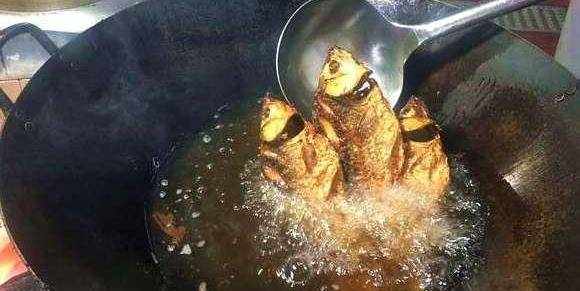 4,鍋中加適量多一點食用油,將油溫燒至7成熱時,放入整理好的魚進行炸制,炸至鯉魚酥脆時撈出濾油。