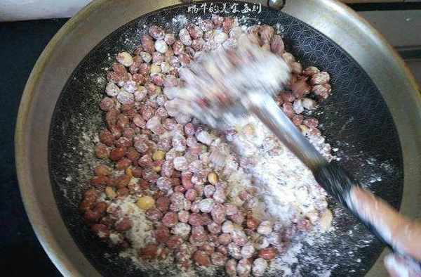 8,倒入幹淀粉快速翻炒,讓每顆花生裹上淀粉。