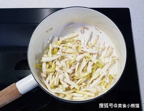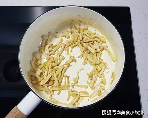 5、炒約5分鐘,至雪白菇縮水,表面呈現微黃。