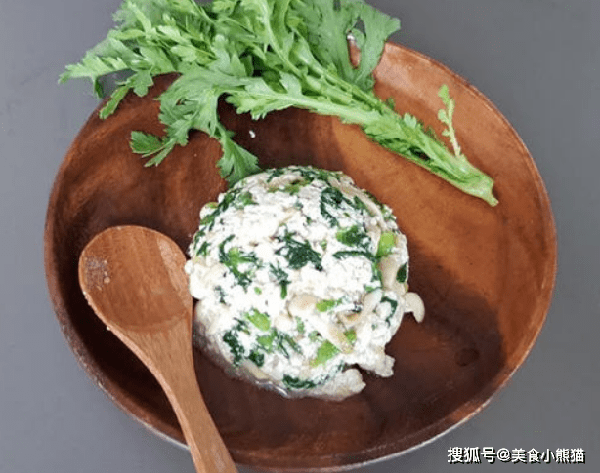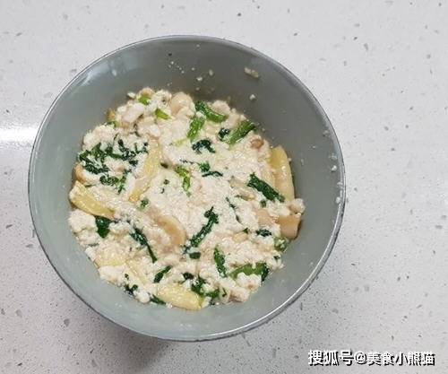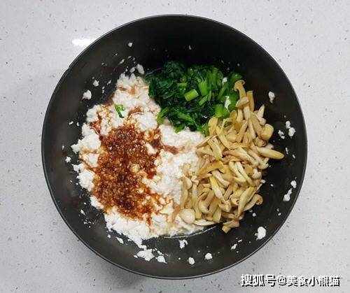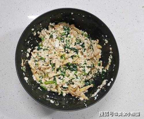 14、將備炒好用的雪白菇、山茼蒿、調味醬加入豆腐泥中。