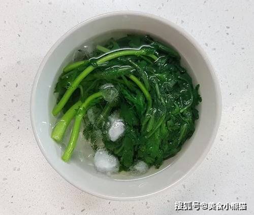 9、取出山茼蒿,放入冰水降溫。