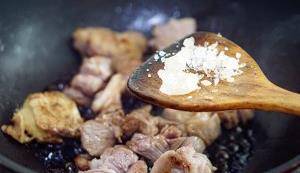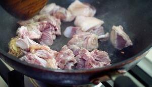 下羊肉,炒到表面剛好變色。