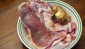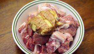 羊肉洗幹凈,有空的話可以在水裡泡泡去血水。老薑一大塊。