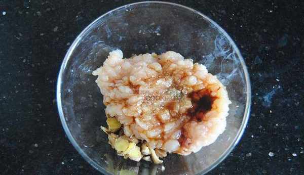2,雞肉剁碎,加入薑片,醬油,鹽,胡椒粉,瑤柱攪拌均勻。