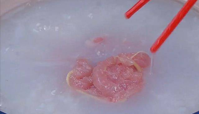 粥燜煮好後放入醃制好的瘦肉,再用筷子輕輕地攪散肉絲