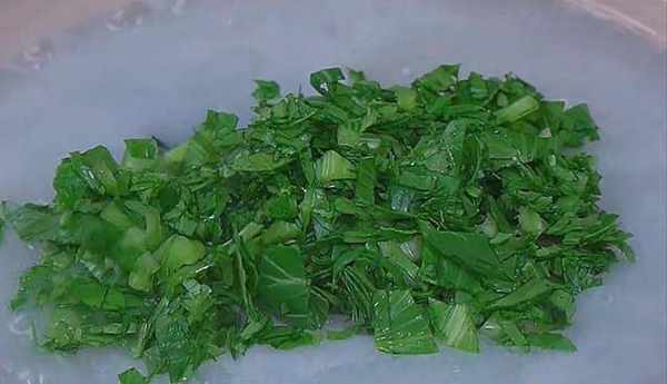 加好肉絲後再放入切好的皮蛋丁,一小勺鹽,一小勺胡椒粉,還有切好的青菜碎