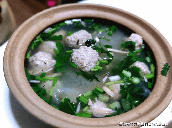 3、用勺子撇掉浮沫,丸子全部浮起後,放入冬瓜片煮一會兒,加入適量食鹽、雞精、胡椒粉調味,攪拌均勻後撒上香菜末,淋上香油即可。