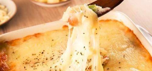 2、把黃土豆泥放在鐵板上,中間放適量的紫土豆泥,上面放一層黃土豆泥。抹平後,撒上磨碎的奶酪,放入多功能蒸爐烘烤約8分鐘,服務。