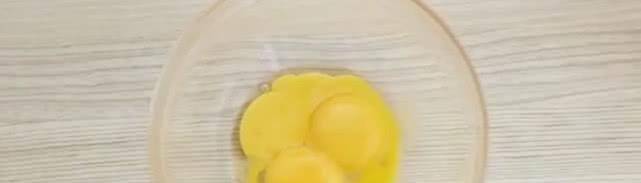 3.準備一個碗,打兩個雞蛋,把蛋黃放在裡面,把蛋黃打散,然後倒入混合好的面粉裡,再倒入冷卻的油,直到所有的材料完全混合,這樣就可以開始瞭面團。