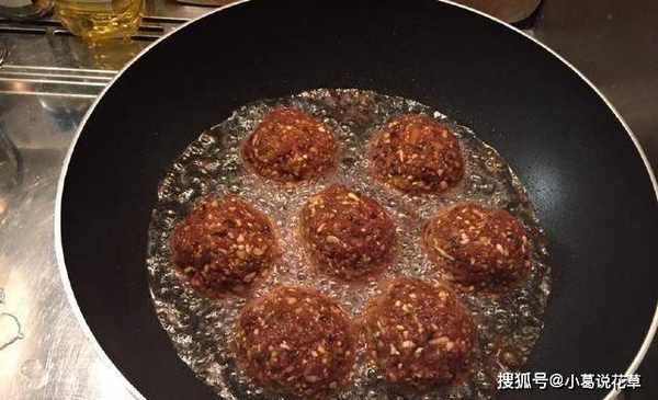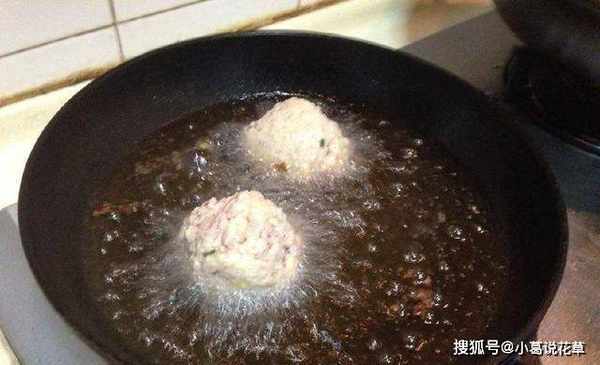 第二步:把肉餡揉成幾個均勻的球,下面燒熱鍋,倒入食用油,油熱6分鐘後,把球放進去炸,放入時不要馬上攪拌,等丸子成型不散開後,翻過來煮。將丸子表面炸至金黃色,撈出瀝幹油備用。