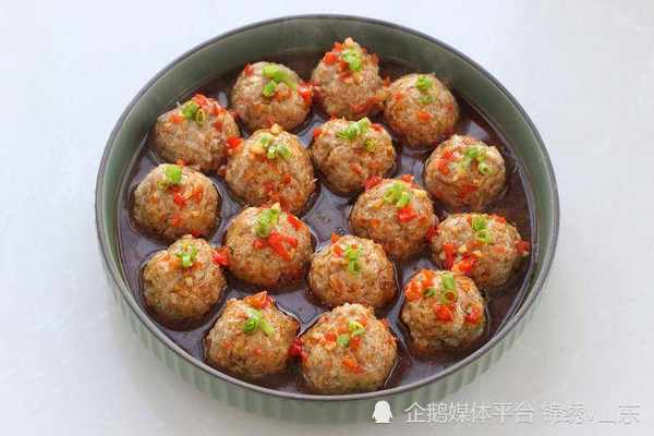 2. 調制好的蓮藕肉餡團成丸子後放入盤中;
