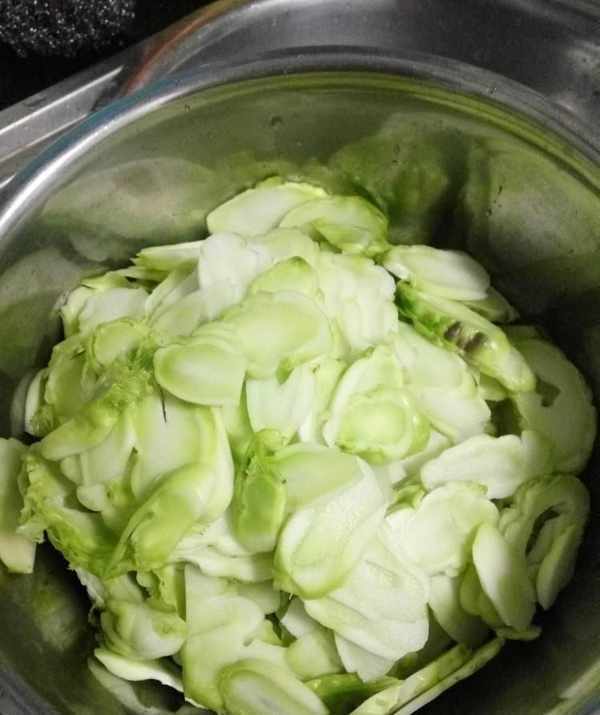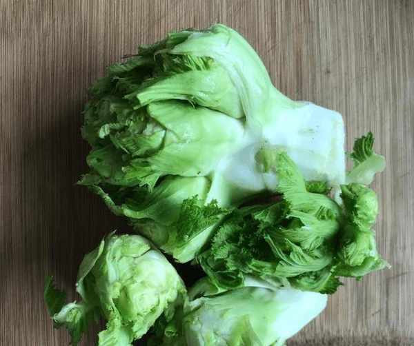 Step1.材料準備好後,將包兒菜表面清洗幹凈,用清水將包兒菜漂洗幾遍,瀝幹水分,切塊,裝盤待用。