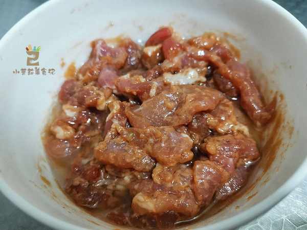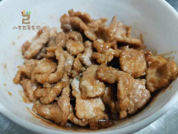 1、先來準備一些瘦肉,牛肉豬肉都可以,切片之後,加料酒,生抽,玉米油拌勻,接著再加一小勺淀粉,再一次拌勻醃制待用。