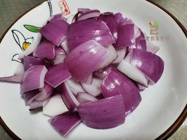2、紫色的洋蔥更適合炒著吃,口感脆,香味濃烈,剝下適量的洋蔥後,掰小塊裝盤即可。