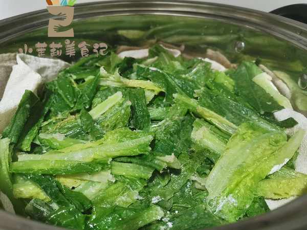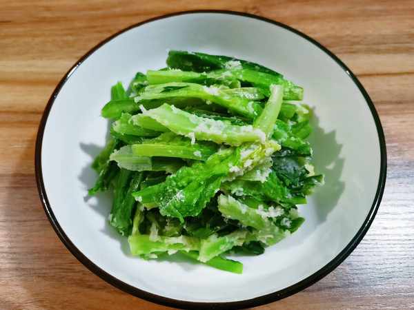 3、在蒸籠上一定要鋪上紗佈,接著把油麥菜放到裡邊。開火加熱,水開以後再蒸5分鐘左右就可以瞭。可以看到油麥菜的葉片變為深綠色,面粉也不再幹瞭,這時候就熟瞭。關火以後,馬上揭開蓋子,把油麥菜倒出來。
