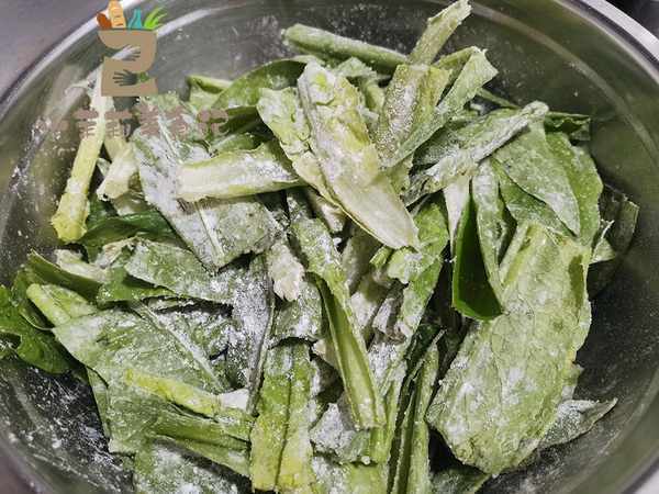2、先在油麥菜的葉子上淋一點玉米油或是橄欖油,不需要多,幾滴就可以,然後拌勻,覆蓋到葉片表面。然後我們開始加面粉,也可以用玉米面,加一點進去,就拌一拌,然後再加,直到油麥菜的表面都包裹上粉類就可以瞭。