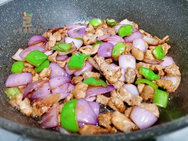 5、洋蔥和青椒倒進鍋裡,加一點老抽,然後用大火來炒,這樣二者的香味都會被高溫激發出來。接著把肉再一次放進去,加一點黑胡椒碎,這道菜的靈魂就出來瞭,立即出鍋吧。