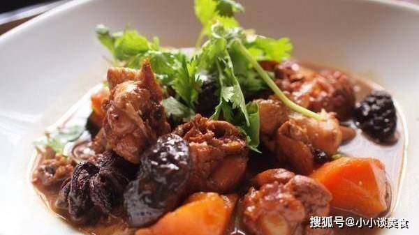 3.蓋上浸泡香菇的水或加入少許高湯(如果有的話),直到雞塊被淹沒。大火燒開,文火煮約20分鐘至湯汁收幹,再大火翻炒幾下,下蔥出鍋