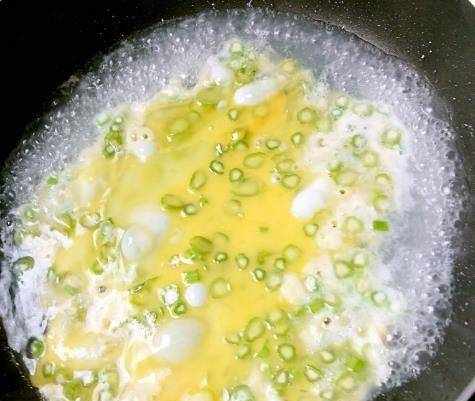 首先,我們將雞蛋打入碗中,加入料酒和鹽,因為料酒可以去除魚腥味,然後拌勻備用。最好用不粘鍋,以免炒雞蛋焦糊。鍋裡放半碗水,燒開,倒入蛋液,撒上蔥花。待蛋液凝固後,我們一邊快速翻炒一邊攪拌,然後就可以快速的從鍋裡撈出來瞭。