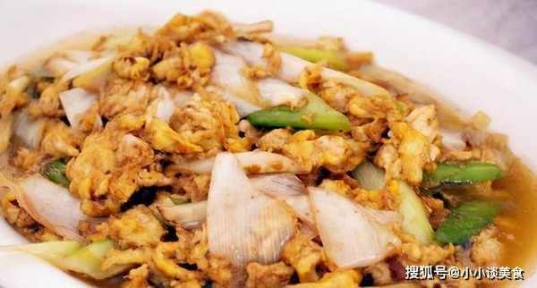 7.雞蛋在鍋裡裹上醬汁後,加少許水淀粉,將葉子放入鍋中,稍微攪拌一下,然後出鍋裝盤