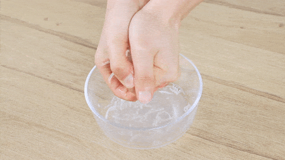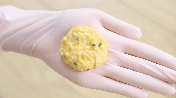 7.用勺子舀一勺糊放到手心,整成餅狀。