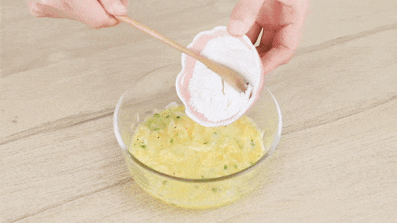 6.倒入中筋麵粉,用筷子攪拌均勻至糊發黏。