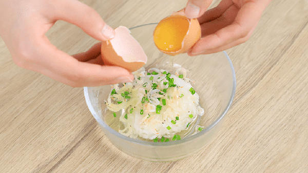 5.擠幹的蘿蔔絲盛入乾淨的碗中,倒入蝦皮、蔥花,再磕個雞蛋,攪拌均勻。