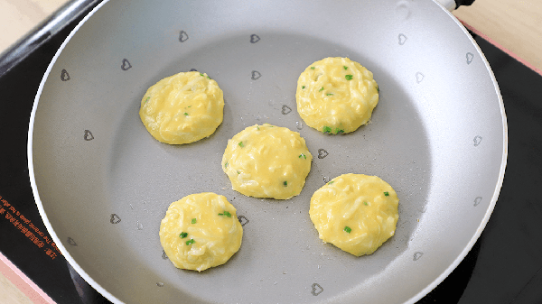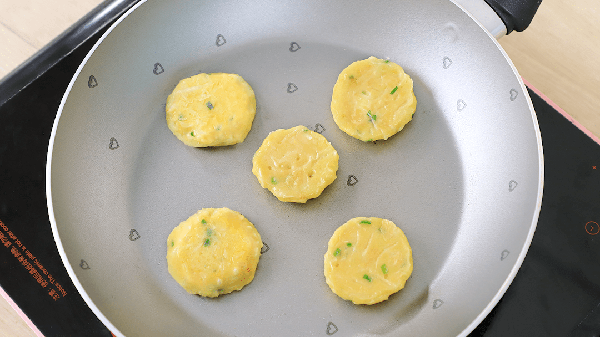 8.平底鍋中倒入少許油,開小火,熱油後放入蘿蔔絲餅。