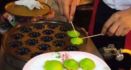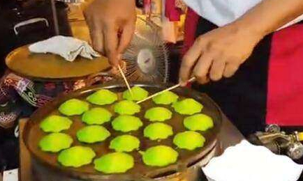 小夥子做的是綠蛋糕,形似花朵,看起來非常漂亮。制作方法和普通的蛋糕做法基本相同,隻是在制作中添加瞭一種叫斑斕葉植物的汁液,從而使顏色變成鮮艷的綠色。
