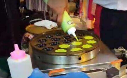 這樣的綠蛋糕才賣一元一個,因為小夥子的制作方法都是大傢看的見的,所以吃起來也很是放心。很多傢長來接送孩子的時候,總要買點一起品嘗……另外小夥子還時不時的更換模具,使蛋糕有更多可愛的外形,而保持對學生們的吸引力。別看這小小的蛋糕,一天賣300個,輕輕松松的,你們吃過麼?