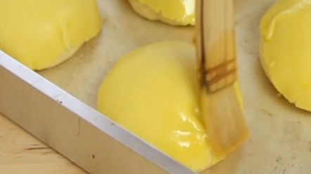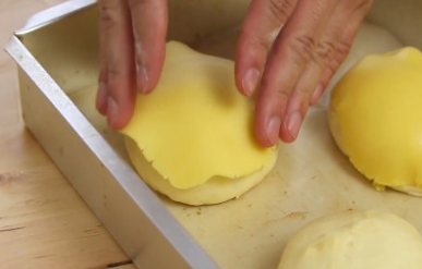 第五步:再用搟面杖搟成圓餅狀。蓋在之前發好的面包上面,然後在皮山刷上一層蛋液。放到預熱好180度的烤箱裡面,烤制十五分鐘後,就可以拿出來瞭。然後放涼之後,就可以食用瞭!