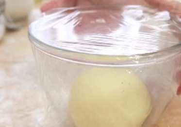 第三步:取出面團後,擠壓面團排出氣泡,分成均勻的8份。然後放到烤盤上蓋上保鮮膜,再次發酵45分鐘。