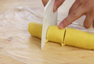 第四步:把低筋麥粉,白糖,一點點食用鹽,奶粉,泡打粉,豬油,牛油混合均勻。然後搓成長條,用保鮮膜裹起來放到冰箱裡冷藏十五分鐘。取出來後,均勻的分成八份。