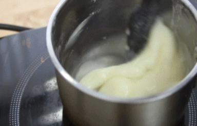 第一步:在鍋裡加入高筋面粉20克,水100毫升,小火攪拌煮成糊狀或者是湯種,然後晾涼備用。