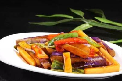 2、等到茄子已經準備好瞭之後將茄子也下鍋開始煸炒一下,將茄子炒軟,將準備好的菜系都放置鍋中的一邊,加入準備好的黃豆醬下鍋均勻的開始翻炒,加上蒜片和薑片下鍋炒香,炒出香味之後還可以將薑片拿出鍋,將炸好的土豆條下鍋一起翻炒,加一點清水蓋上蓋子調至小火燜煮一會兒等到食材煮爛瞭之後出鍋就成。