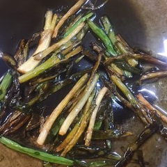煸炒至焦黃變色轉小火,繼續讓它把蔥油炸出來,不要懷疑就是這個顏色,變得有點黑黑的,這個時候就已經很香瞭,蔥油的味道,然後這個時候準備一個小碗,把糖鹽雞精醬油生抽水調好,倒進鍋內,跟蔥油攪拌一下味道完全的攪拌在一起,然後裝碗,備用,這個步驟我沒有拍,所以用文字表達瞭,圖片裡還有綠色的蔥段是因為之前沒放完,後面丟進去瞭