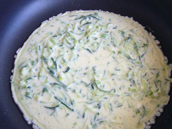 8.倒入拌好的面糊,轉動鍋體使面糊均勻攤開