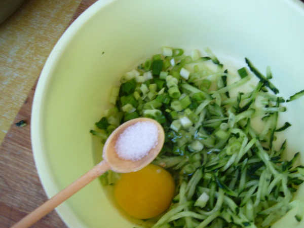 3.把雞蛋打入裝有黃瓜絲的碗中,在加入適量的鹽,攪拌均勻