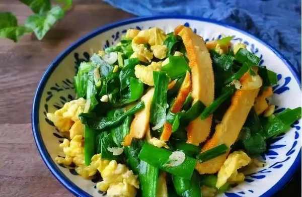 2、將韭菜洗凈後甩幹水分,切成小段,香幹切絲。韭菜的桿子和葉子分開放置,一會下鍋的時間不同。