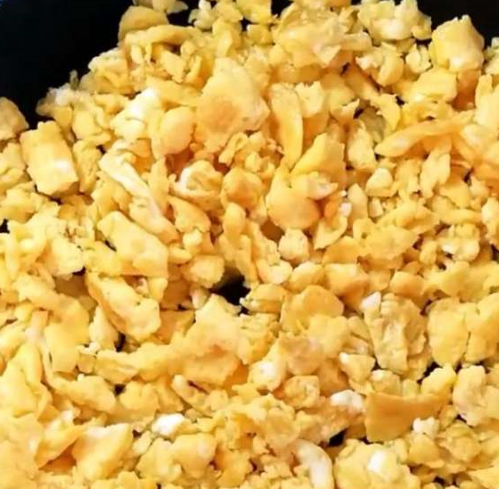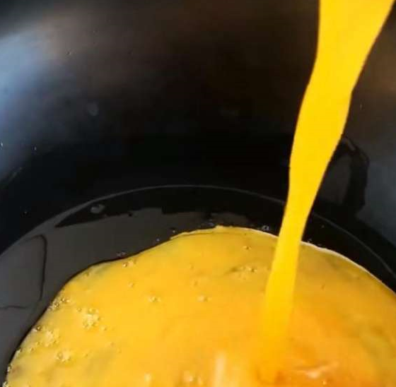 鍋中加入油燒熱,把雞蛋液下入鍋中炒,炒到雞蛋熟。