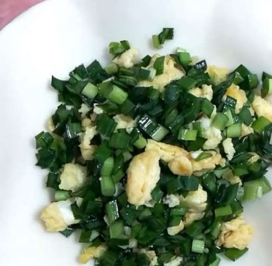 把炒好的雞蛋放到一個碗裡,加入切好的韭菜,一樣一拌。