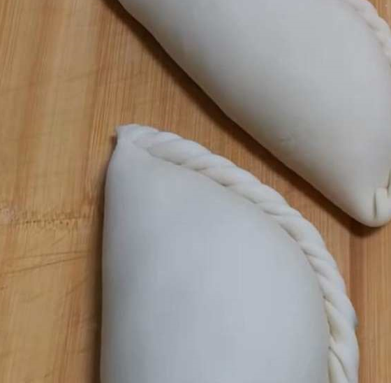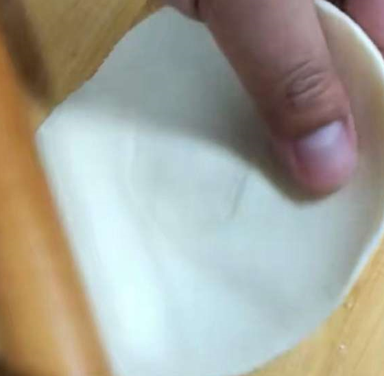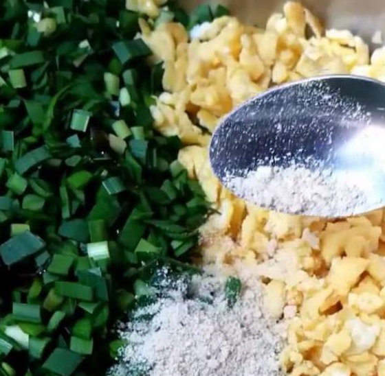 取上一張餃子皮,中間放上拌好的韭菜雞蛋陷。